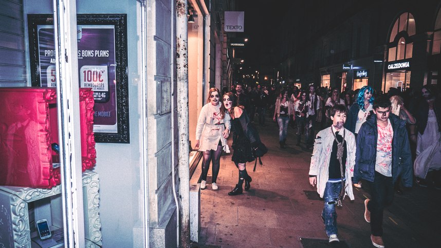 Les zombies font du shopping Ces zombies cherchent surement le dernier modèle du sac en peau d'homme. Tag Lumière Portrait Gens Zombie Couleur Bleu Marron Rouge Lieu Nantes Appareil Panasonic Lumix DMC-GH4 Évènement Zombie Walk de Nantes - 2014